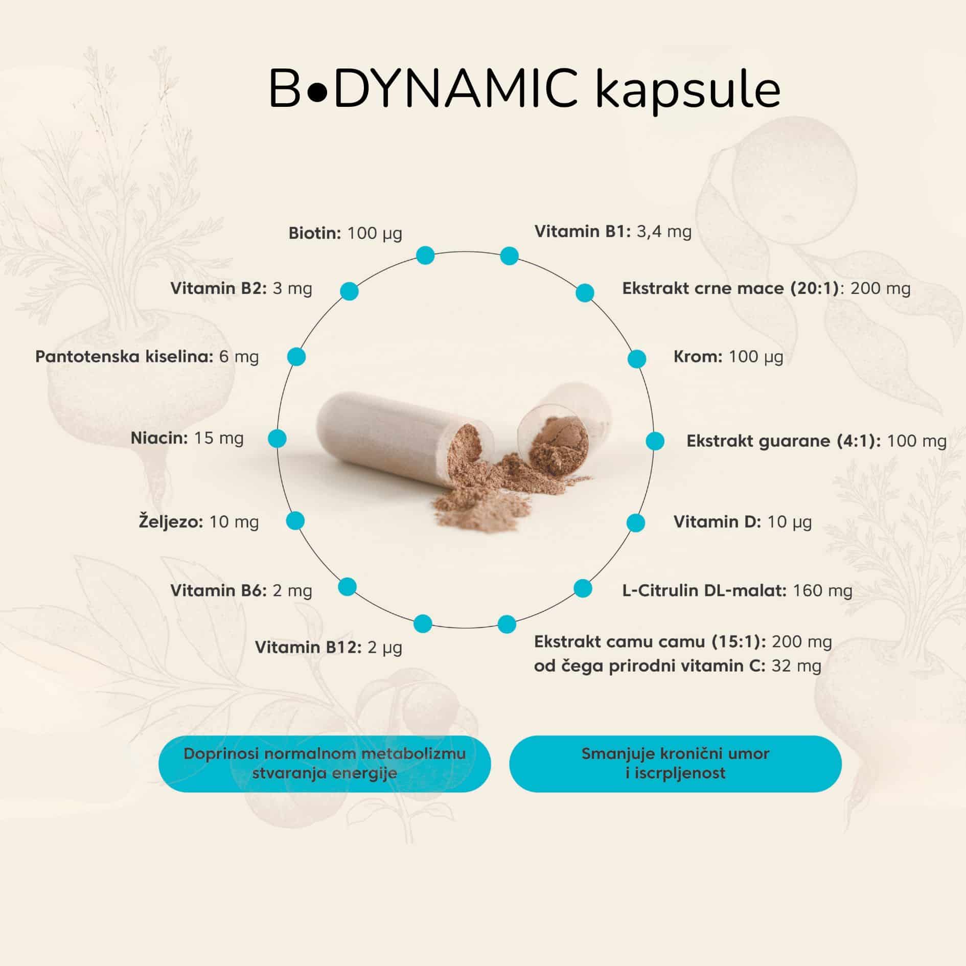 B-Dynamic kapsule objedinjuju tri snažna biljna ekstrakta – crnu macu, guaranáu i camu camu – uz L-citrulin malat, aminokiselinu poznatu po podršci cirkulaciji i opskrbi mišića kisikom, te vitamine B skupine, vitamin D, željezo i krom, pružajući sve što vašem tijelu treba za dnevni unos i optimalnu energiju. Sinergijska formula osigurava postupno i dugotrajno povećanje energije, podržava koncentraciju, izdržljivost i otpornost na stres, bez naglih padova energije.