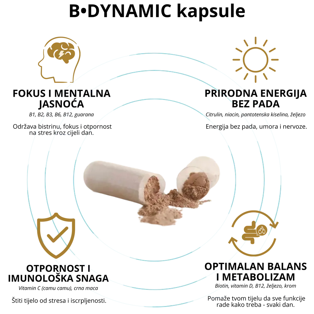 Umor i pad fokusa nisu tvoj normalan ritam. B•DYNAMIC kapsule ti vraćaju energiju i koncentraciju – prirodnim putem.
